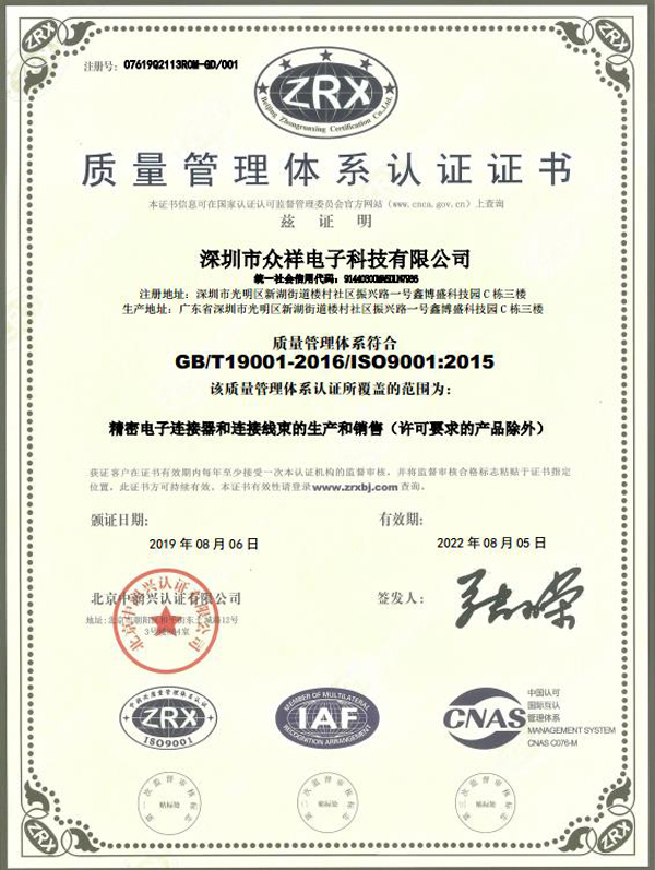 技術(shù)創(chuàng)新與品質(zhì)保障是眾祥電子的核心競爭力。公司嚴(yán)格執(zhí)行 ISO9001:2015 質(zhì)量管理體系認(rèn)證及 CE、CB、RoHS 等國際認(rèn)證,產(chǎn)品以高精度、耐復(fù)雜環(huán)境的特性贏得市場認(rèn)可。法定代表人周世新帶領(lǐng)團(tuán)隊(duì)以技術(shù)創(chuàng)新為核心,持續(xù)開發(fā)多功能、多系列連接器產(chǎn)品,并與比亞迪集團(tuán)、日本 TAIYO、深圳藍(lán)胖子機(jī)器人、中科院及中國航天等國內(nèi)外頂尖企業(yè)、科研機(jī)構(gòu)建立戰(zhàn)略合作,共同推動(dòng)連接技術(shù)在高端裝備中的應(yīng)用創(chuàng)新。同時(shí),通過精益化生產(chǎn)管理,構(gòu)建覆蓋研發(fā)、制造、售后的全流程服務(wù)體系,為客戶創(chuàng)造長期價(jià)值。