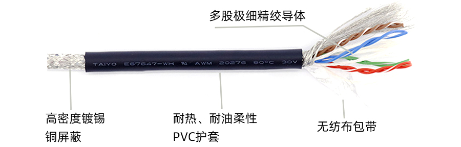3.電源線和網(wǎng)線選擇:靜態(tài)使用環(huán)境選擇國(guó)產(chǎn)品牌,動(dòng)態(tài)使用環(huán)境選擇進(jìn)口。進(jìn)口日本TAYO網(wǎng)線,雙絞編織屏蔽層>85%,高柔耐彎折1500-3000萬次。高速拖鏈選3000萬次。